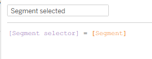Step 3: Create the calculated field to filter your charts. To ensure that only the segment selected in your toggle is being shown, you need to create a Boolean calculation which can then be added to the filters pane. This calculation is saying when your parameter specific segment equals your field specific segment, return true (e.g. if your parameter is showing corporate, it will return true for your corporate value within the segment field and false for the other two values).