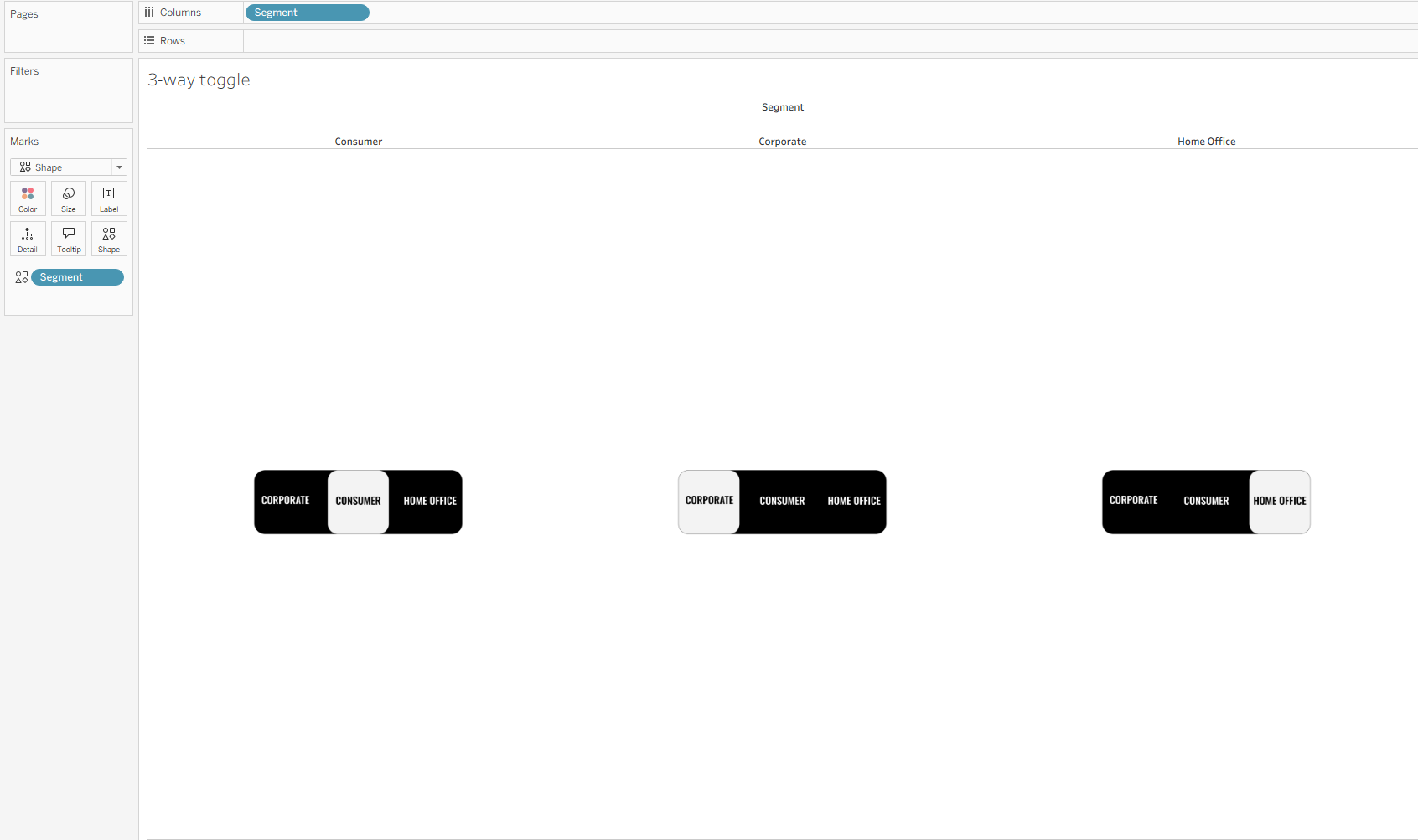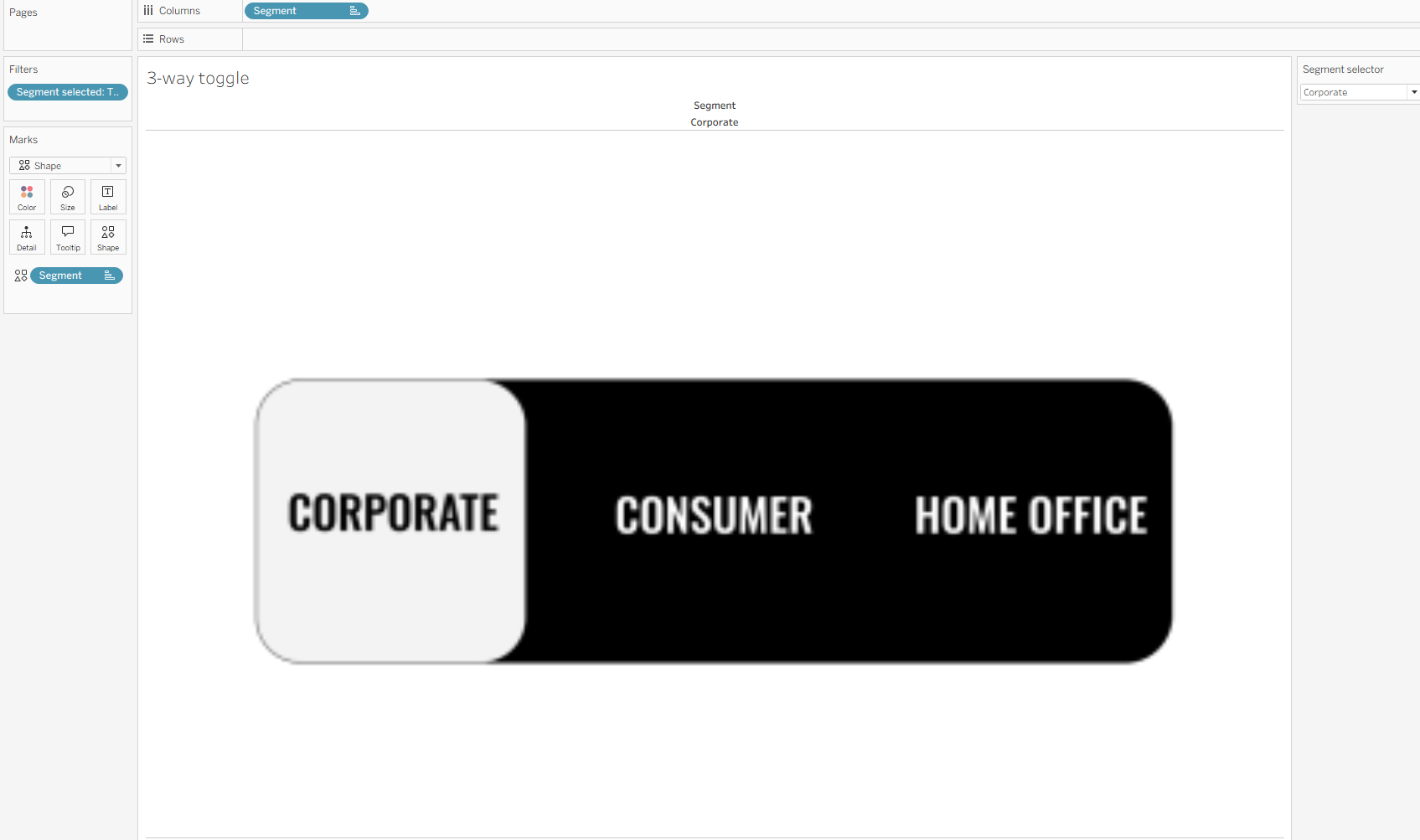 I was lucky enough the first time around not to encounter this problem but as it turns out, the way I set up my buttons is not the same as the order that they've come out in Tableau as they aren't alphabetical. For example, I have consumer in the middle of my toggle and it's on the left of the pane. This won't be an issue in a second but might prove to come back to bite you if you just ignore it. So, I'd recommend switching the columns around forcibly in your sheet by dragging consumer to the right in the header. Before we add the filter, duplicate the sheet for your toggle overlay. Then add your newly created calculated field to the filter pane and select true so you only see the toggle which highlights the value in your parameter. Make the size of the shape large enough to fill your worksheet and turn off tooltips. Now you have the base of your toggle, the visual part at least.