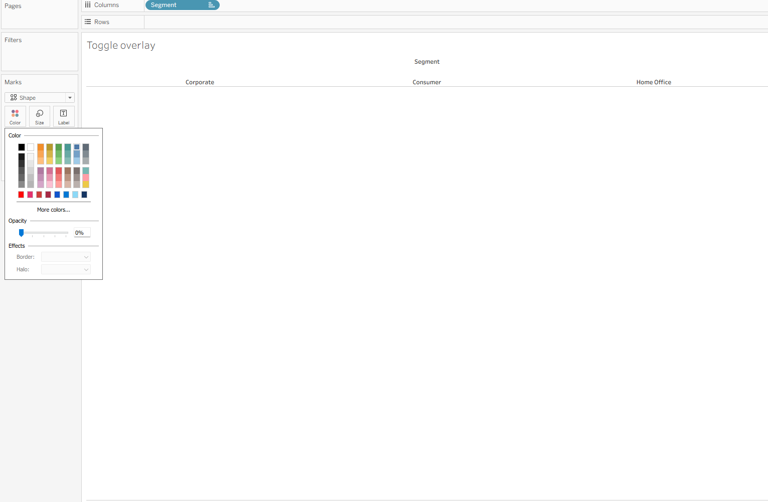 Step 5: Create your toggle chart. Start by adding segment onto columns, setting the screen to 'entire view', setting your marks to shape and then adding segment onto shape as well. Now you can assign your toggle images to the appropriate segment.