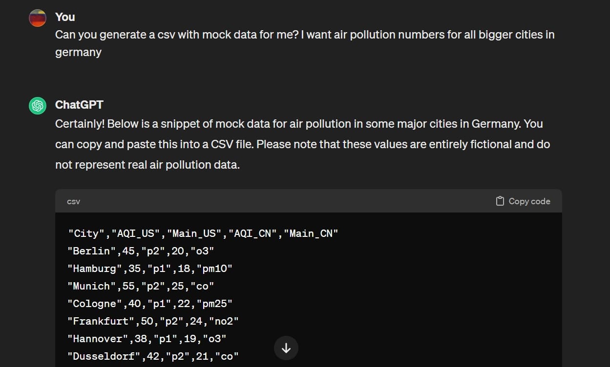 I was really frustrated, because we only had 2 hours left to finish the dashboard and the presentation. So before I couldn't work on a visualization at all, I generated some mock data with ChatGPT. Once I can finish the API calls I will easily be able to switch out the mock data with the real values.