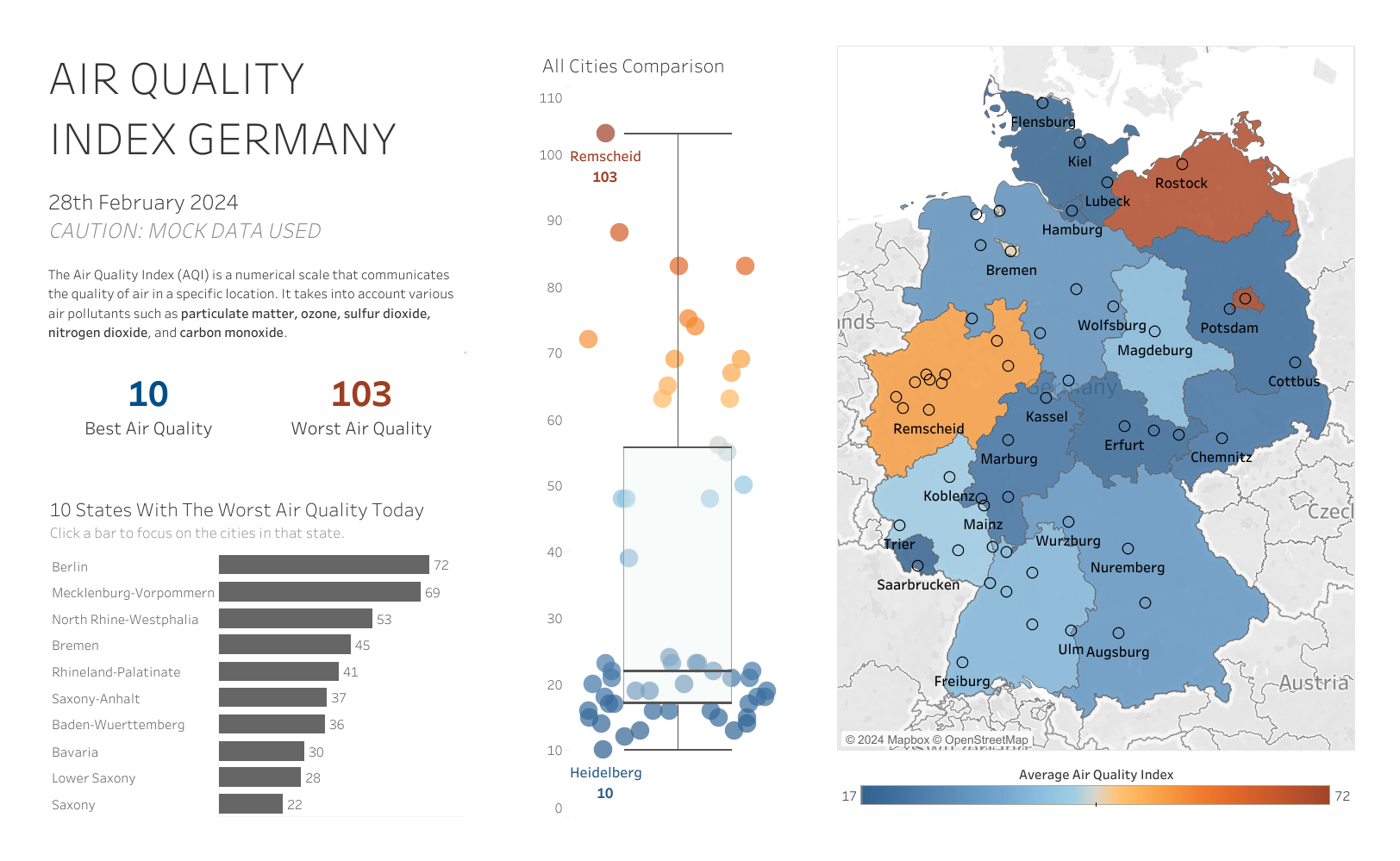 So, here is my small dashboard on the Air Quality Index Germany. Beware that the numbers are fake, but enjoy looking at it nonetheless 😉