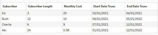 To start, we have a dataset with only 4 rows of data, each representing a subscriber, how much they pay per month, when they started subscribing, and when they finished. Right now, making a visualization showing profit over time would be impossible. To map out a graph over time, we need to have each month represented as a row in the dataset. This is where scaffolding comes to the rescue!