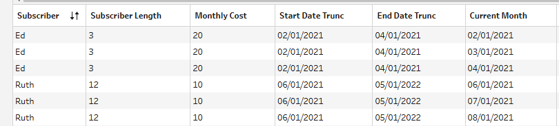 Ed is now correctly represented in 3 different rows, with the "Current Month" column having a date for each month subscribed. Now that we have successfully scaffolded our data, we can bring it into Tableau and visualize it!