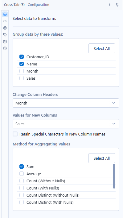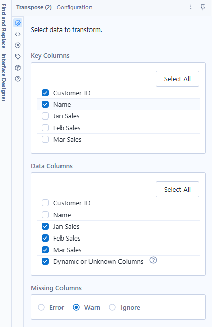 Once you connect the transpose tool to your input data, you will see configuration options on the left: