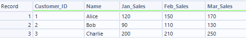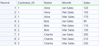 Select your key columns (Customer ID, Name) and your data columns (all the months sales). The output will then look like the longer table below, and you can then use a select tool to rename our new columns to month and sales.
