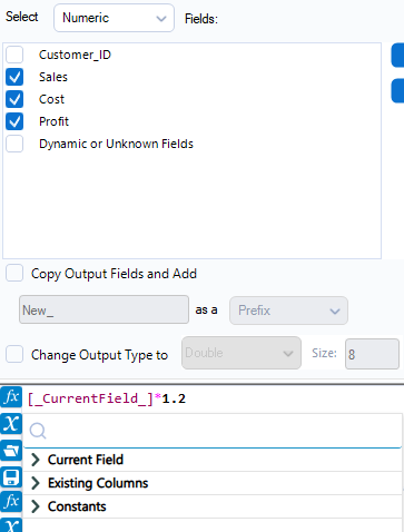 Select the fields you wish to apply the formula to, and then click on the X icon in the pane at the bottom. This will load the Current Field, Existing Columns and Constants dropdown. We can then type in the formula [_CurrentField_] * 1.2. It is important to untick the 'copy output fields and add' box, as this will create 3 new columns instead of just updating the existing table. Our output will then look like this: