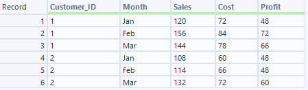 This tool allows you to apply a formula across multiple fields (columns) at the same time. For example, using the dataset below, we can apply a 20% increase to Sales, Cost and Profit with a multi-field step.