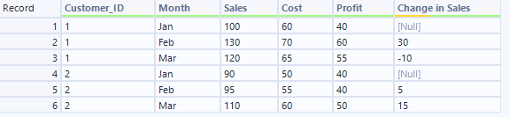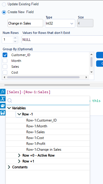 Multi row - similar to filling down in Tableau Prep, this can allow you to update fields based on data from surrounding rows. In this example, I want to find the month-by-month change in sales. After adding a multi-row step, the following view will appear on the left: