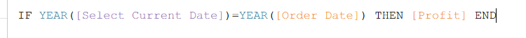 This was the broadest comparison in the session. The logic is fairly simple. One calculation returns profit where the order date falls in the same year as the selected current date: