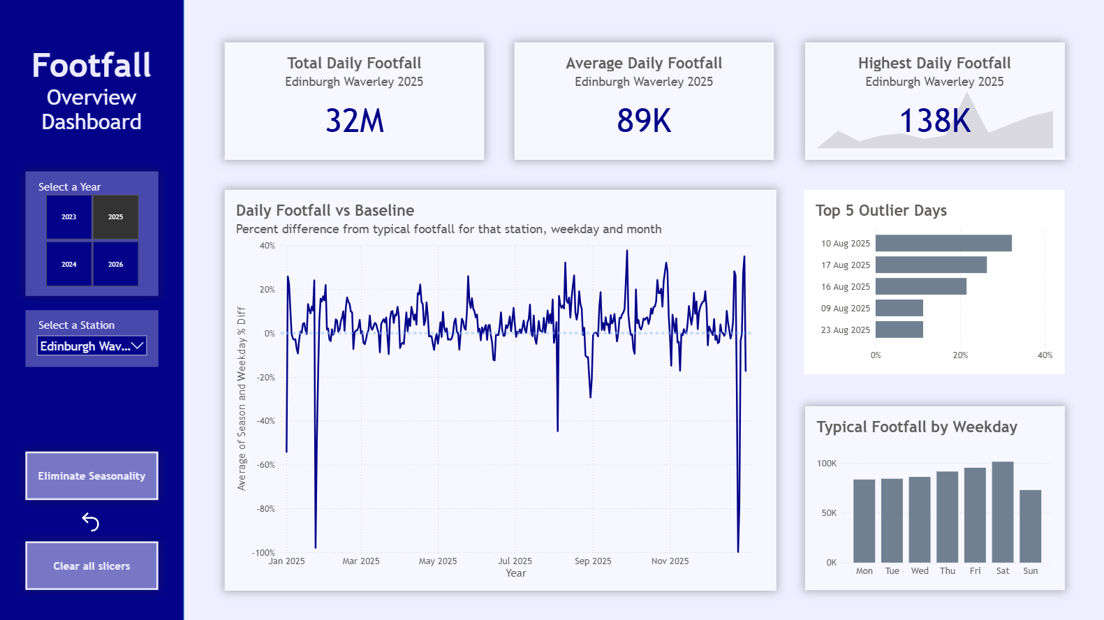 Alongside the main variance chart, I also included a top 5 outlier days section for the selected station and year, plus a chart showing typical footfall by weekday. That means the dashboard is not just showing whether a date is above or below baseline, but also giving some context around what “typical” actually looks like for that station.