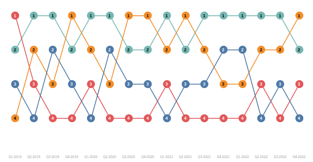 It was possible to make a Sankey chart using my data, so I did, but it looked a bit strange. The default in the Tableau extension was to color ranks 1-4 differently for each year (how is it supposed to know that they mean the same to me?), and sort the rankings by their convenience to the flow, not by their ordinality. These were some early signs that a Sankey was not the right chart type, but what made it clear to me was recalling that Sankey charts are about flow. This chart type would be more appropriate for asking the question "how did 2023 division winners fare across the next two years", or "how did last place teams from 2022 improve over time". The chart is best suited to see how things flow out of one category and into others, it is less appropriate for tracking individual groups over time.