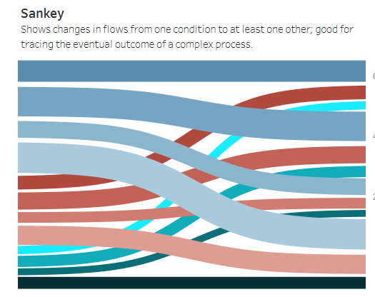 My first thought when I came up with this use case was a Sankey chart. Sankey charts show how individual records flow from category to category. The key word here is flow, which is the section that Andy Kriebel placed Sankeys in on his Visual Vocabulary Dashboard (his example is below).
