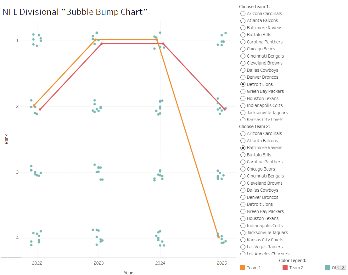 Last, I want to show off the example that I think best demonstrates the value of this new chart design. In this instance, the two selected teams – the Detroit Lions and Baltimore Ravens – have had extremely similar trajectories over the past four years. They both went from 2nd to 1st to 1st, before splitting up in 2025. The original bump chart would have had these lines directly on top of each other, and the Sankey chart would have shown these as one thick connection rather than two distinct teams until the final year. This new chart design shows that although these are two distinct teams, they followed a virtually identical trajectory for 3 years, then split off. One possibly difficulty with introducing this new chart type is making it clear that the exact positioning of the points (whether they are high or low for their bubble) does not matter. The idea here is that points from the same bubble are viewed as essentially the same. I think a clearer bubble shape, as in the sketch, would sell this idea a bit better.