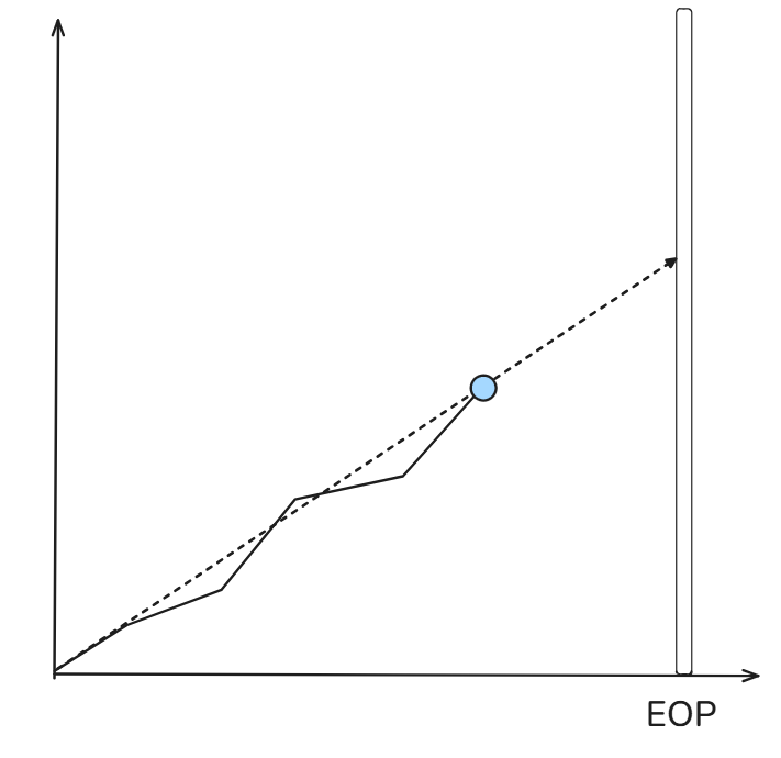 In the above example, there are two points that are found on the same rate line, but the one that occurs earlier accumulates more uncertainty, so its range includes values both above and below the green target line. For the later data point, the final range is tight enough to fully exclude any amounts below the target, making the user "confident" in the fact that the true end amount will be above the target.