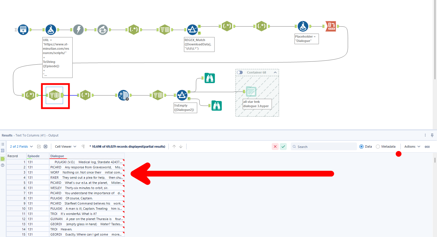 Now we have one row for an actual line of dialogue! We have reached the marked point of my alteryx workflow and will take a pause until the next part, where we will parse out the speakers and dialogue separately, and get individual rows for each word of dialogue. Stay tuned!