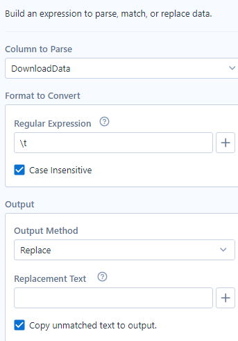 To continue where I left off, my next cleanup operation required aRegEx tool to remove all of the lingering tab characters from the original indentation structure. To remove the tab characters, I used a RegEx replace, finding all of the tab characters "\t" and replacing them with an empty string. The column name "DownloadData" is an artifact from the Download tool, which can be replaced once we are certain in what the column is representing.