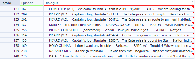 Welcome back to my series on developing an involved Star Trek: The Next Generation dashboard! When we last left off, I had a chopped the combined scripts of all 178 episodes into about 500,000 rows of data where each row (loosely) represented a line of dialogue from the show. What came next was a gauntlet of text parsing that ended up encompassing almost every skill I learned during training!