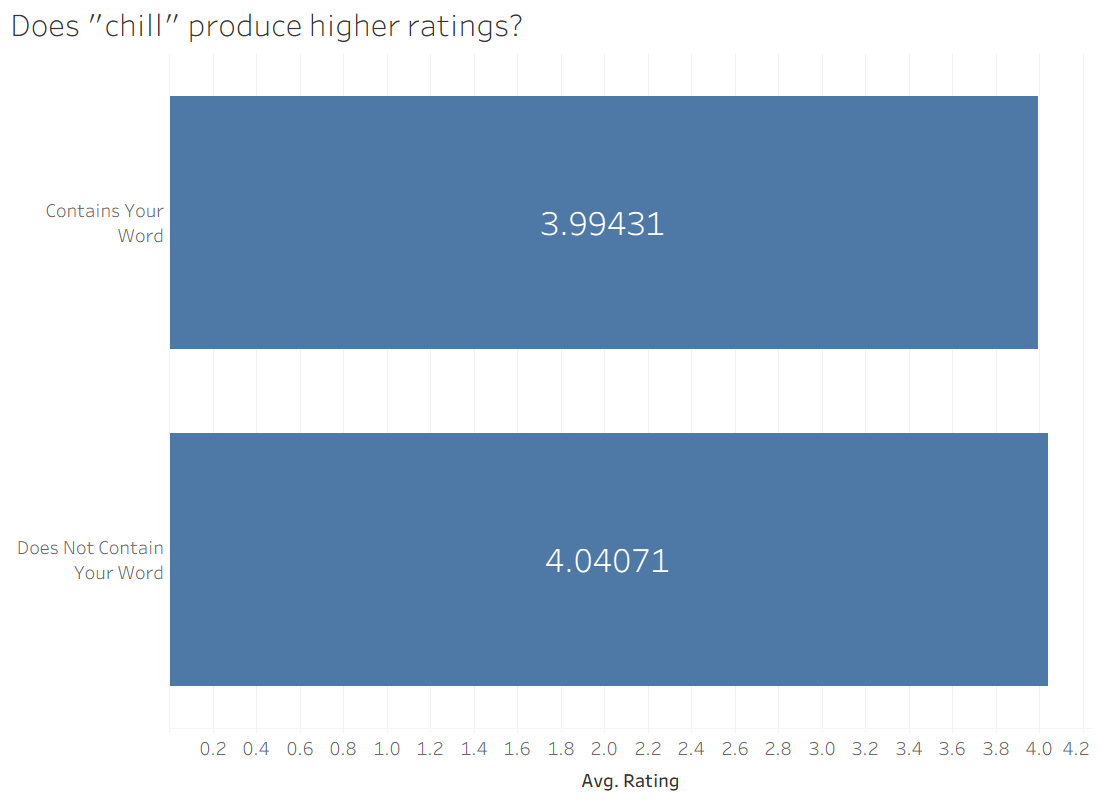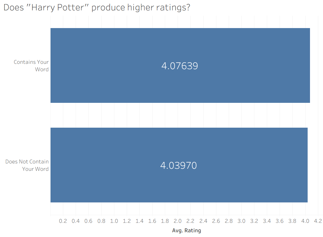 It looks like the books with "Harry Potter" are better, but it's really close. It's hard to say if a difference of 0.04 matters a lot in this case. Similarly, I looked at the word "chill" and found a similar differential: