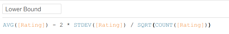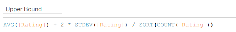 In Tableau, we can calculate an upper and lower bound such that we can be 95% confident that the range between them includes the true mean. The calculations look like this: