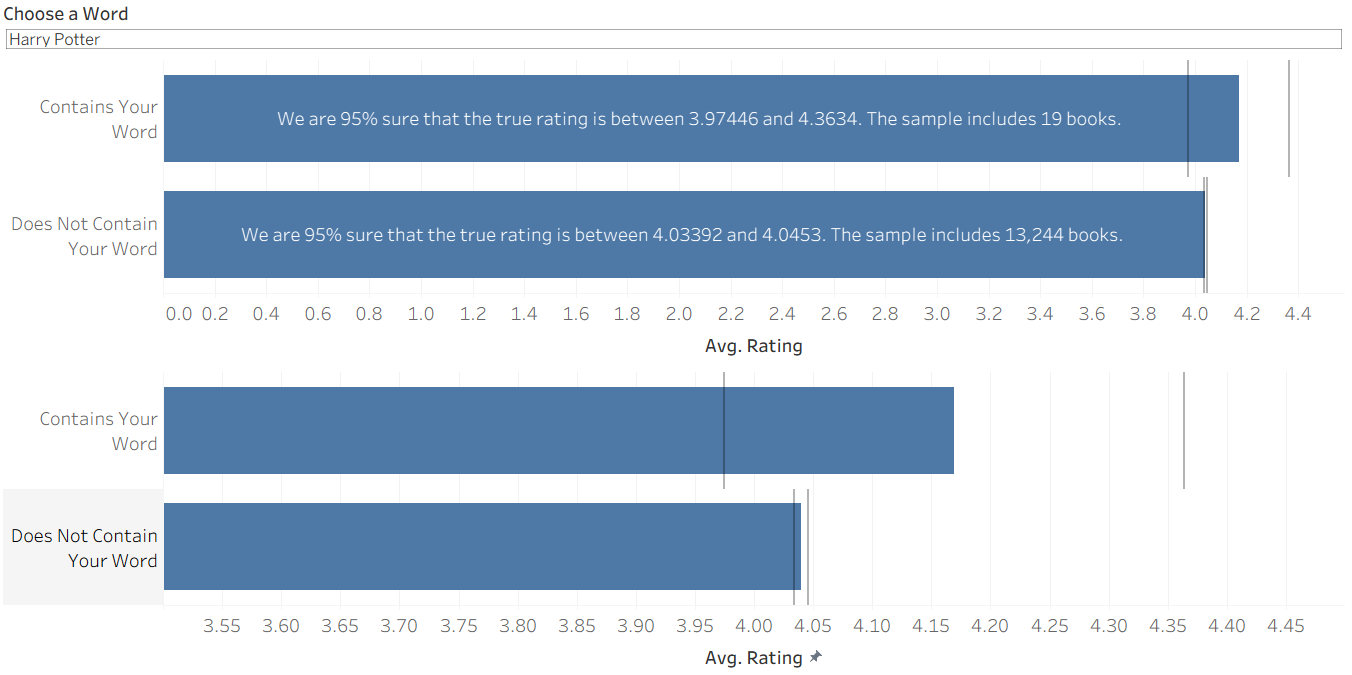 Let's apply it to the original examples! It turns out that 'Harry Potter' has a pretty small sample size, so even though it seems to produce higher ratings, this could be a result of randomness. In the end, we cannot conclude that a book's description containing "Harry Potter" has any association with its rating. (Note: The lower bar chart reflects the same information but with a restricted scale for easier viewing.)