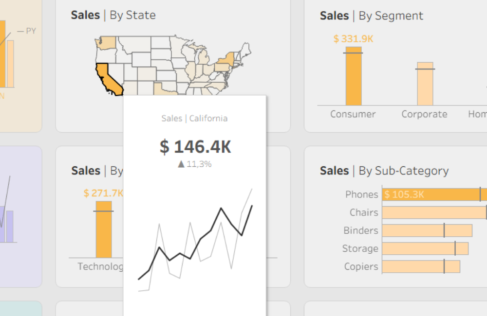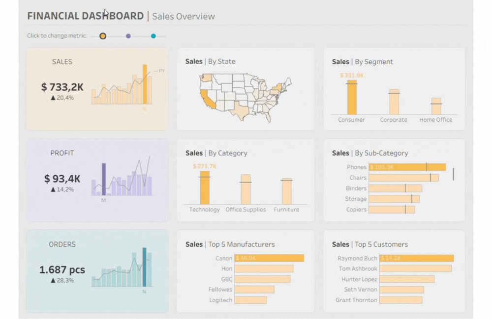 I decided to recreate that specific interaction here, using Parameter Actions to shift the focus between Sales, Profit, and Orders with a single click. To make it feel just as responsive, I also implemented the highlight trick that keeps the active dot bright. It’s a great way to handle navigation without cluttering the UI, and it fits perfectly into the clean, app-like look I was building for this dashboard.