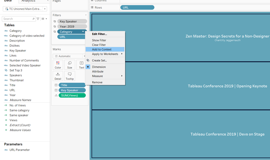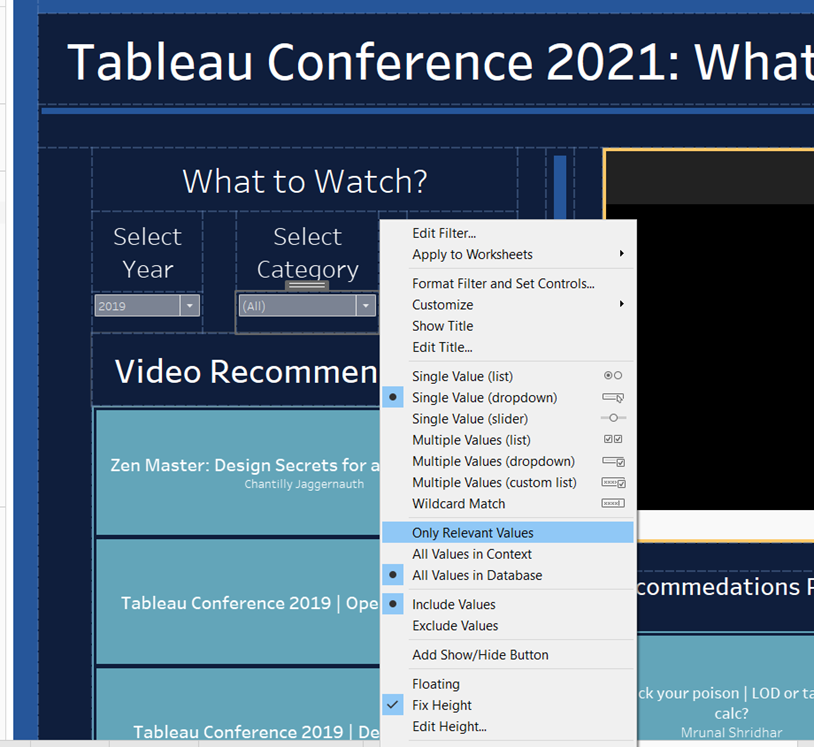 There is a potential problem with using ‘Only Relevant Values’ that is important to remember. If it is set for all three filters, Year, Category, Speaker, then if a category or speaker value has been selected then the year filter will only have one or two values that apply to the category or speaker value selected. Therefore if I want to select different year to see who spoke that year or what categories are available I would have to clear all filters or select all in category and speaker. This makes it slightly confusing and difficult at times for the end user when trying to navigate to a particular video selection. This is currently a problem for category and speaker filters, where selecting a speaker reduces category values shown and selecting a category reduces the speaker values show, but for the dashboard purpose it was not an issue. Therefore, the ‘Only Relevant Values’ only works well when the filters are in a clear hierarchy in this example Year → Category → Speaker. The first filter in the hierarchy, in this case Year, should therefore ‘Keep All Values in the Database’.