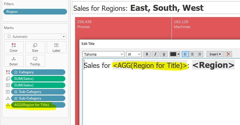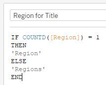 However, with a simple calculation we can enable our 'Region(s)' part of the title to dynamically update to reflect the number of dimensions showing. In a new calculated field create as below: