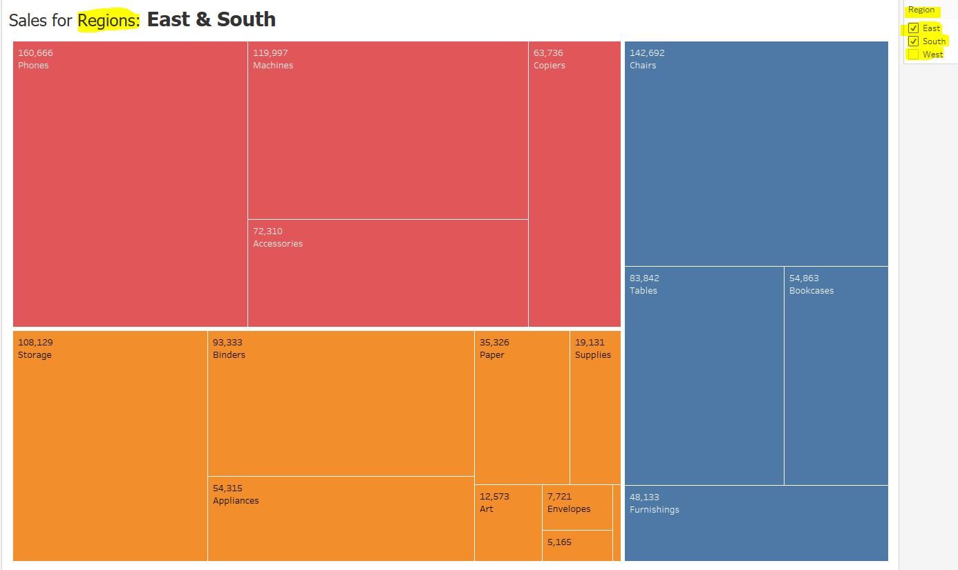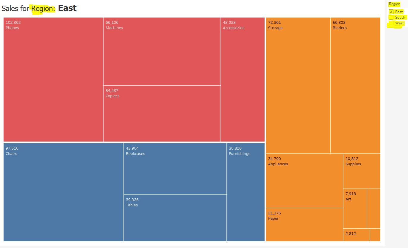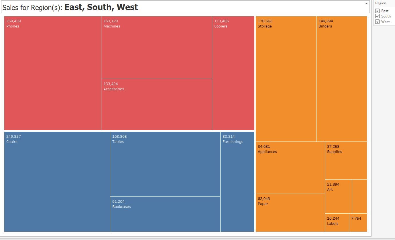 In Tableau it is always good practice to include a title so viewers and users are clear on what a visualization is representing. Below we have a treemap showing the Sales by sub-category for different regions. We also have a filter to enable Sales to be viewed for selected regions only: