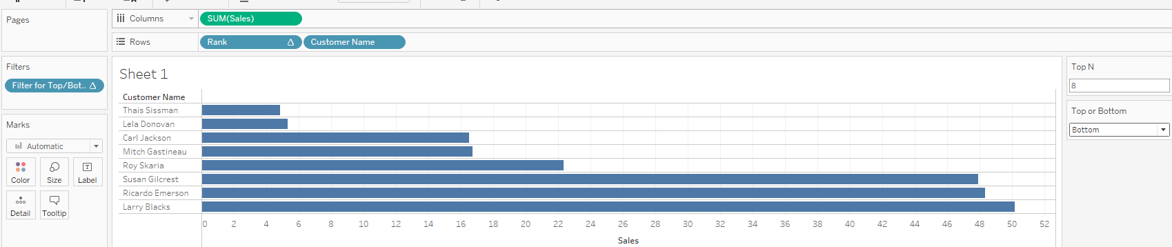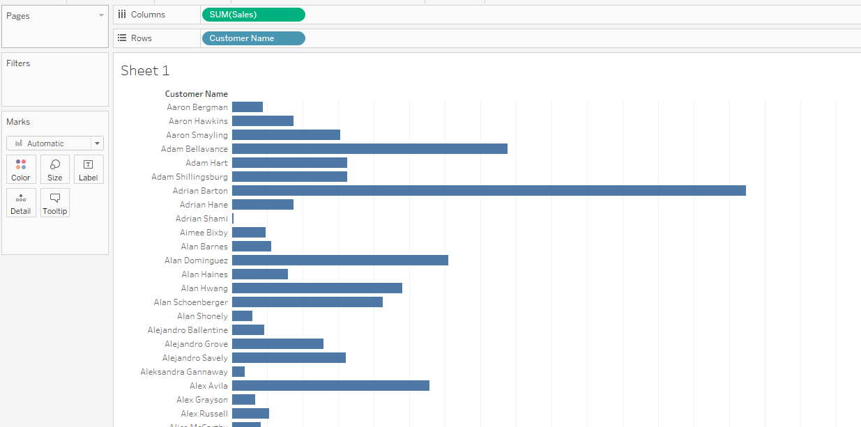 First we need to drag 'SUM(Sales)' onto Columns and 'Customer Name' onto Rows: