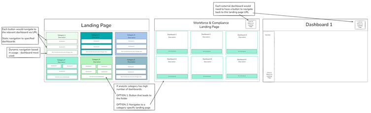 Our initial sketches were straightforward with six coloured tiles to distinguish the categories, each containing buttons that would statically navigate to specific dashboards. However, we realised we could only fit about 3–4 buttons per tile before things got crowded. If a category had more than four dashboards, I proposed two options:
