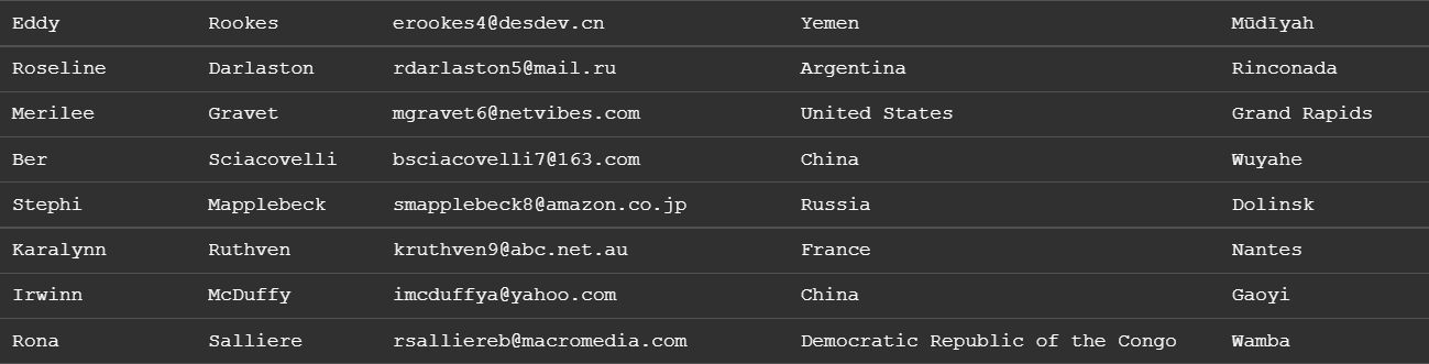 From my perspective, a particularly impressive and important feature for making your data feel real is that fields are not all randomly assigned independently of each other. What that means is that when identifying fields like names or geographic locations are used in a dataset, values for other fields are restricted based on them. This means that first and last names will match up with full name fields, emails, and usernames, while cities and states will be restricted to the countries generated for that row. While a small feature, this goes a long way in helping improve the believability of your dataset, which gives later designs built off of it an extra air of legitimacy.