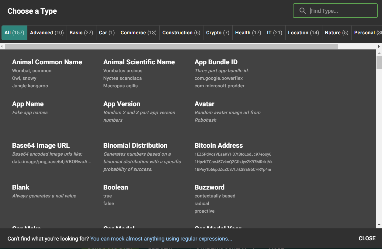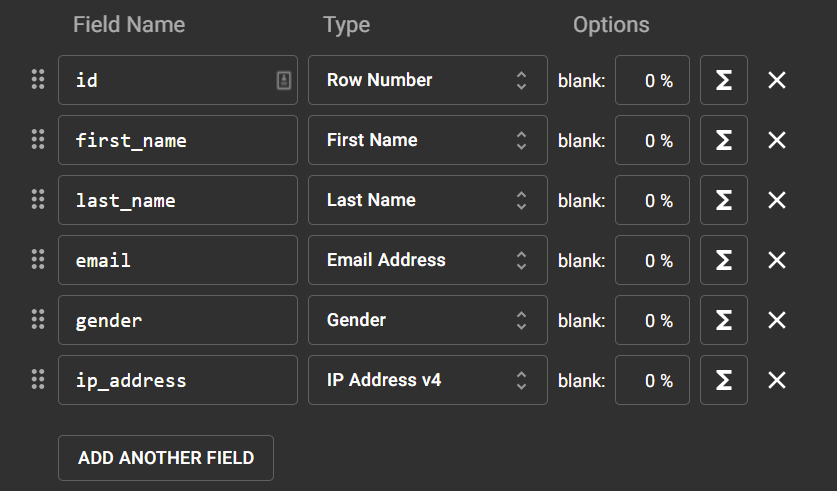 - Dataset Column – allows you to pull records from user-owned datasets that have been uploaded to Mockaroo.