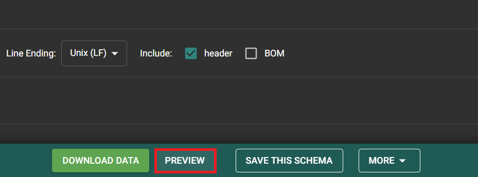 Below the fields we then find further options relating to the format in which the dataset can be exported. Importantly, at any step we can view a preview of the data from a button at the bottom to load a example of our current schema.