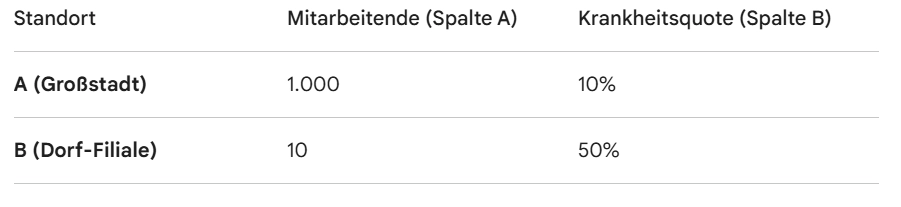 Im Ergebnis würde das bedeuten, dass 30% der Mitarbeitenden krank sind, was nicht stimmt, da die 50% aus Standort B nur 5 Personen sind, während 10% aus Standort A 100 Personen betreffen.