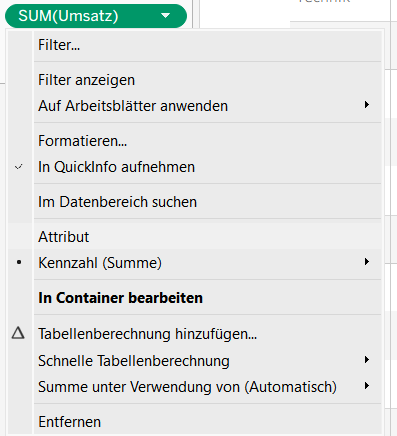In Tableau gibt es aber eine einfachere Lösung das umzusetzen. Wenn wir auf eine Kennzahlpille rechts klicken, finden wir die Option Tabellenberechnung hinzufügen.