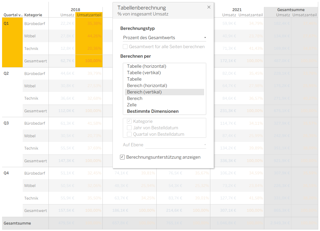 Wir wählen hier die vertikale Berechnung pro Bereich und bekommen dann das folgende Endergebnis.