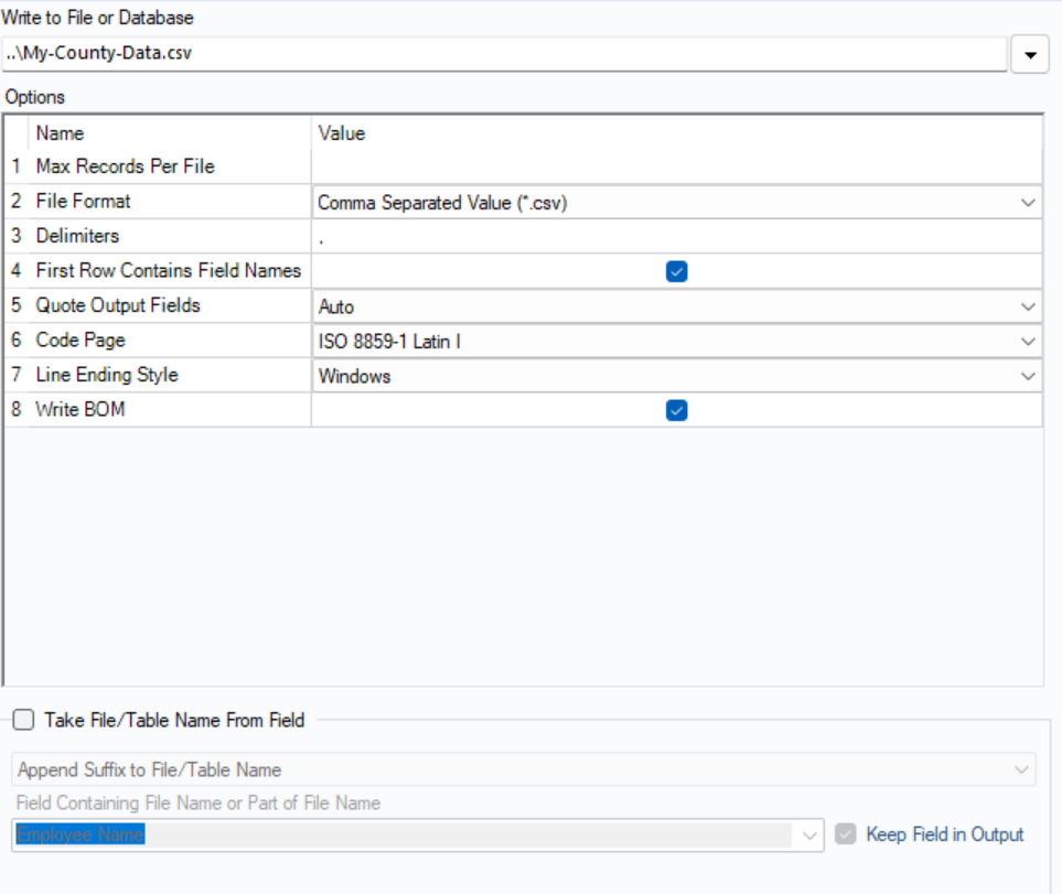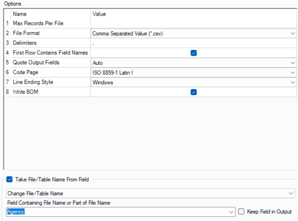 - You can also choose to save your data as separate files, dependent on a certain column's values. In order to do this, select ‘Take File/Table Name From Field’ by pressing the square on the left hand side. After that, use the drop down menu to pick ‘Change File/Table Name’ and then the one below to pick which field (which column name’s values) you want to name your csvs.