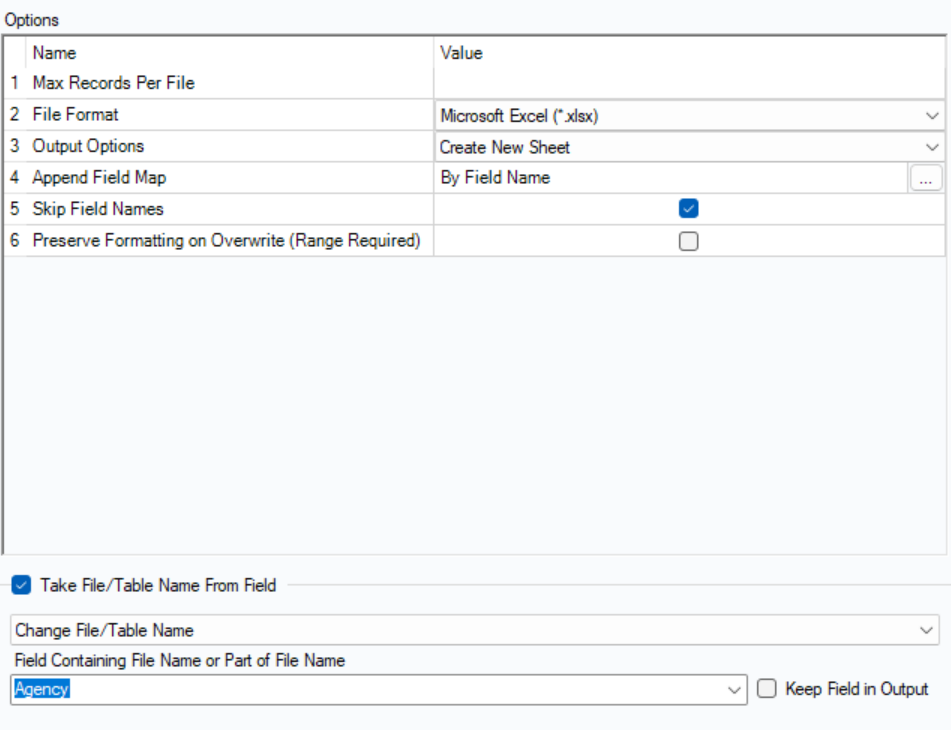 - So, after picking your file format, change the ‘Output Options’ to ‘Create New Sheet’, then once again, select ‘Take File/Table Name From Field’, ‘Change File/Table Name’ and finally the column you want to separate your sheets by.