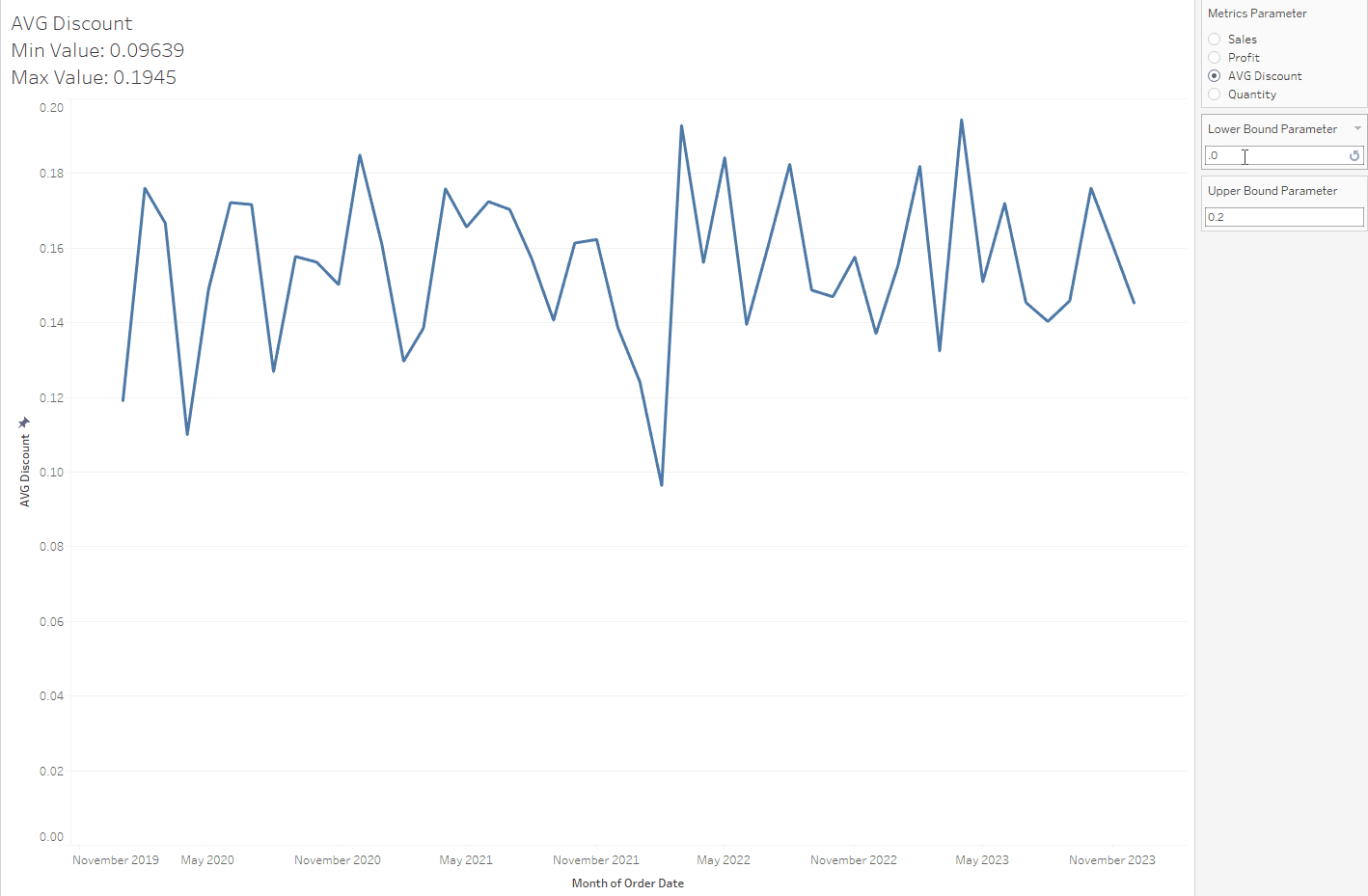 However, if I click on the AVG Discount option, the view is not very nice. There is a blank space at the bottom of the line chart. Also, the y-axis title does not change to the metric that I chose (Image 4). I want to manually edit the axis range.