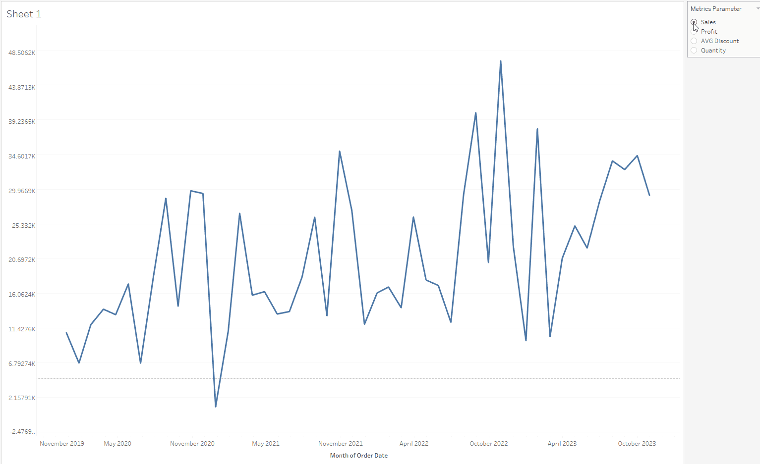 I use the sample SuperStore dataset in Tableau. There are 4 metrics in the dataset that I could use: Sales, Profit, Discount, and Quantity. I would like to compare those metrics by the month of Order Date continuously.