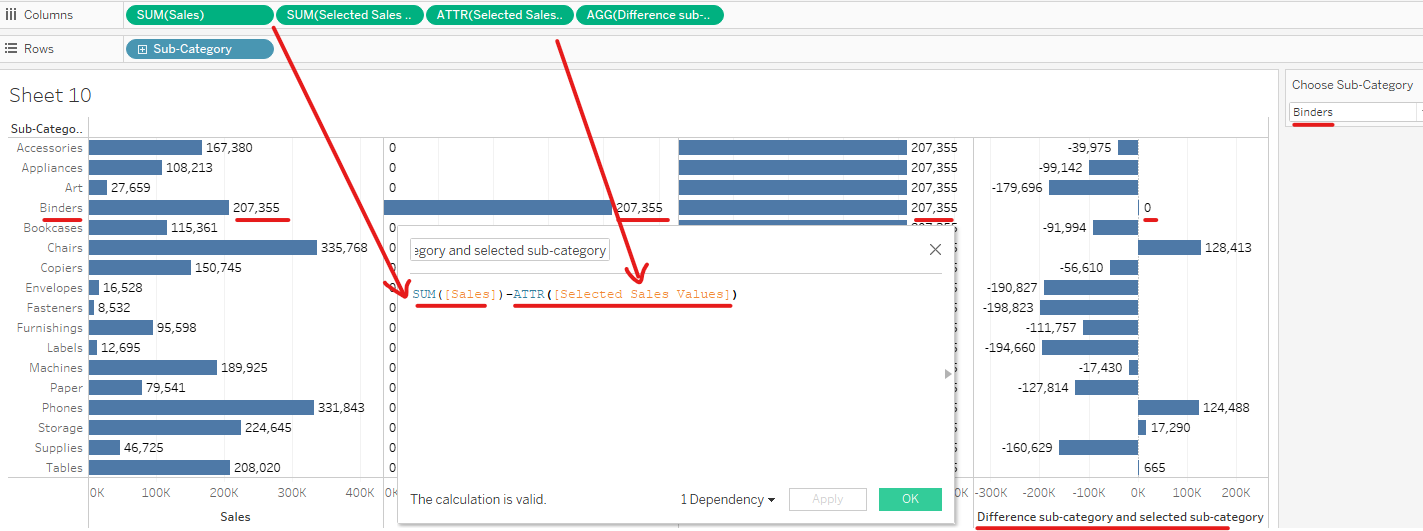 In Image 11, I created a new calculated field to subtract the sum of sales in each category with the selected sale value. In image 11, the difference sale value of the binder is 0.