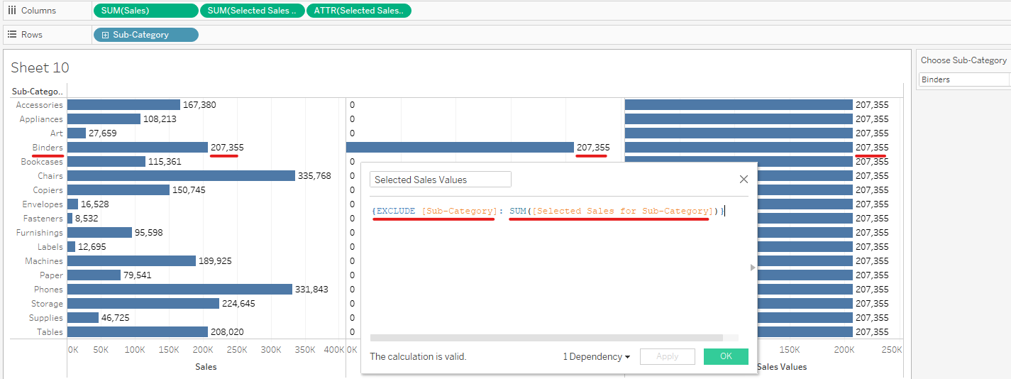 In Image 10, I created a calculated field called Selected Sales Values. It returns the Sum of Selected sales for the Sub-Category that I made earlier and excludes the Sub-Category dimension. The reason that I need to exclude the Sub-Category dimension is I need to show the selected sale value for each row. If I don't exclude the Sub-Category dimension, it will return the sale value of each Sub-Category.