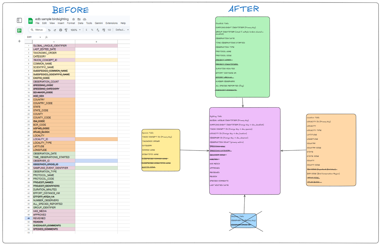 I used an LLM to help me contextualize the field names from the raw table and figure out how to group them into different dimensions. As I have never personally used Ebird, I learned that observers submit their observations in a form, where they can include multiple different sightings. Each table took responsibility over one kind of ID, which allowed me to create 4 different tables. The fact table would hold all unique sightings, and there were 3 dimension tables: 1 for bird species, 1 for localities, and 1 for information about the forms the observers use to submit the sightings.