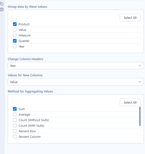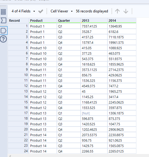 The first step we need to take after establishing this, is to drag the Cross Tab tool onto your workbook. This will produce the options shown below and in this example we would like to group the data by product and quarter, change column header to year and we would like these new columns to show values.
