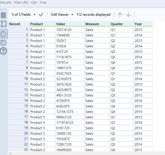 Selecting these options and clicking "Run" will produce the table shown below. This clearly shows the sum of values for each year by product and quarter.