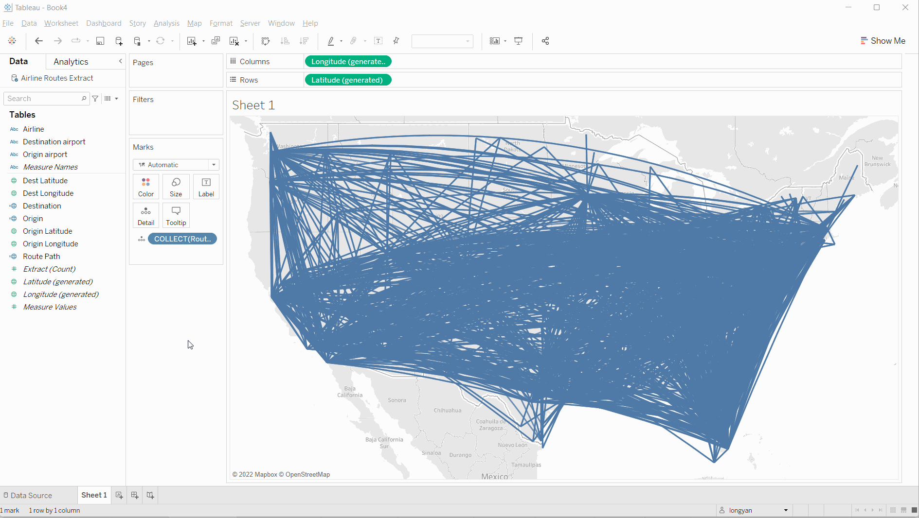 After the Route is done, I dragged it into Detail shelf. When I hover the map, you will see lots of flying path with origin and destination airports' name for it. As you may notice the marks has been changed to 3568.