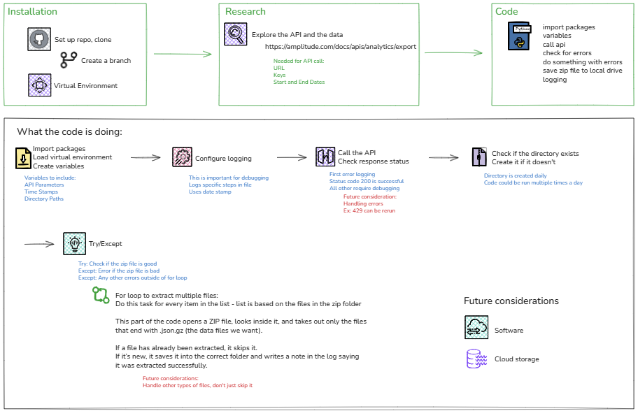 The Python script handled the data extraction process in a structured and transparent manner. It began by connecting to the Amplitude API using securely stored credentials and requesting website traffic data for a defined time range. The retrieved data was saved as a compressed ZIP file and extracted into a temporary directory. Comprehensive logging was implemented to record each stage of the workflow — from successful API calls to potential errors — ensuring clear traceability and easier troubleshooting.