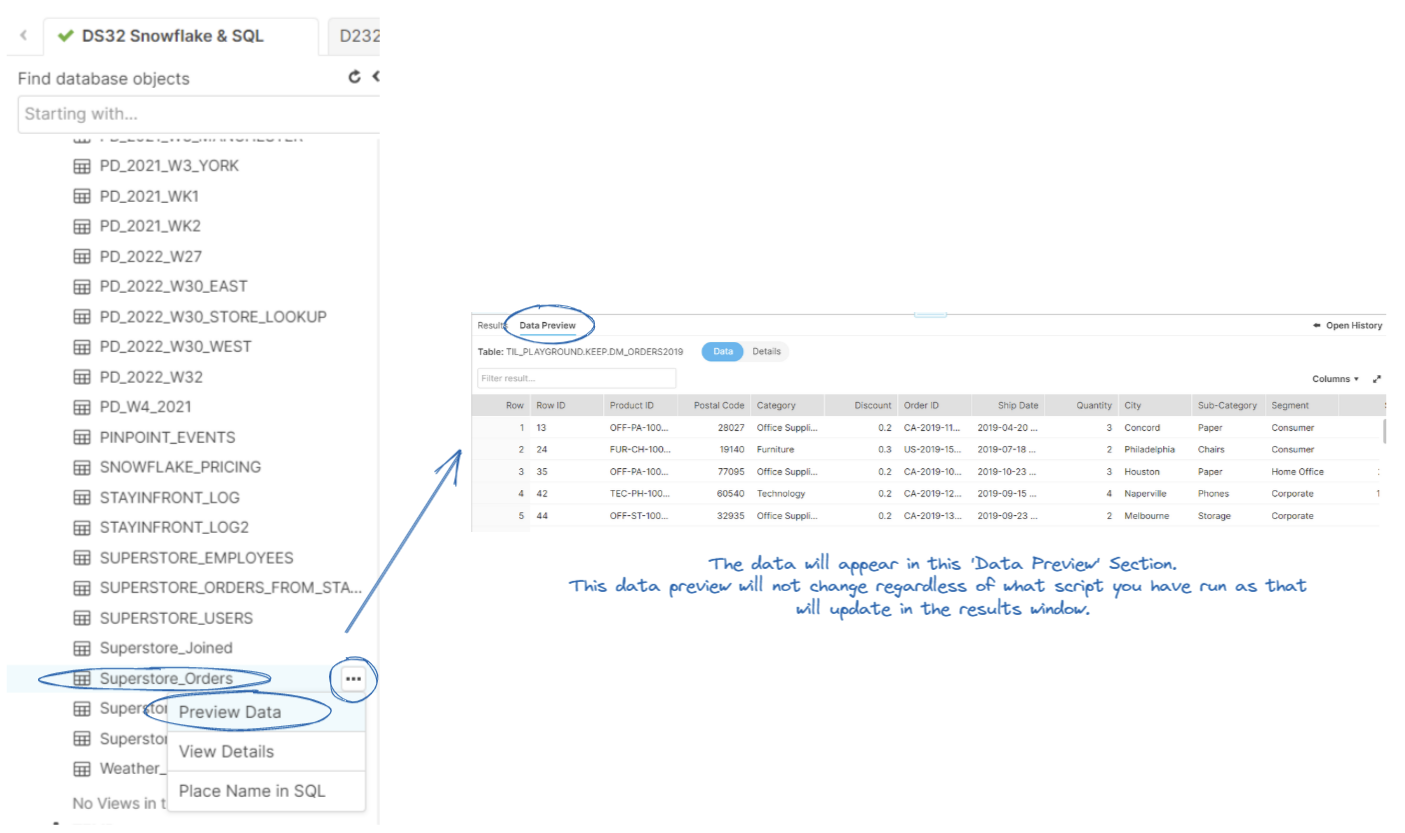 You can also preview data from any dataset - this is a good idea if you are trying to transform a dataset and you want to compare it to the original dataset.