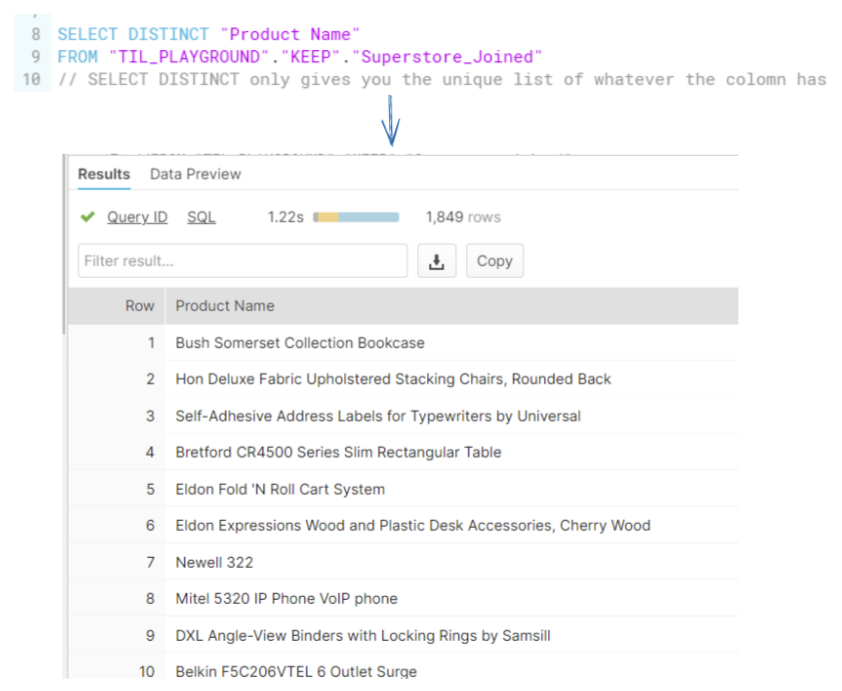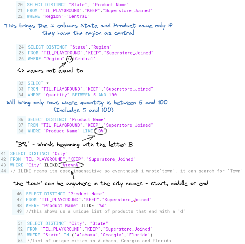 - SELECT DISTINICT "...." - Only the Column specified will show in the dataset [can have multiple columns specified = SELECT DISTINCT "...", "...", "..."]