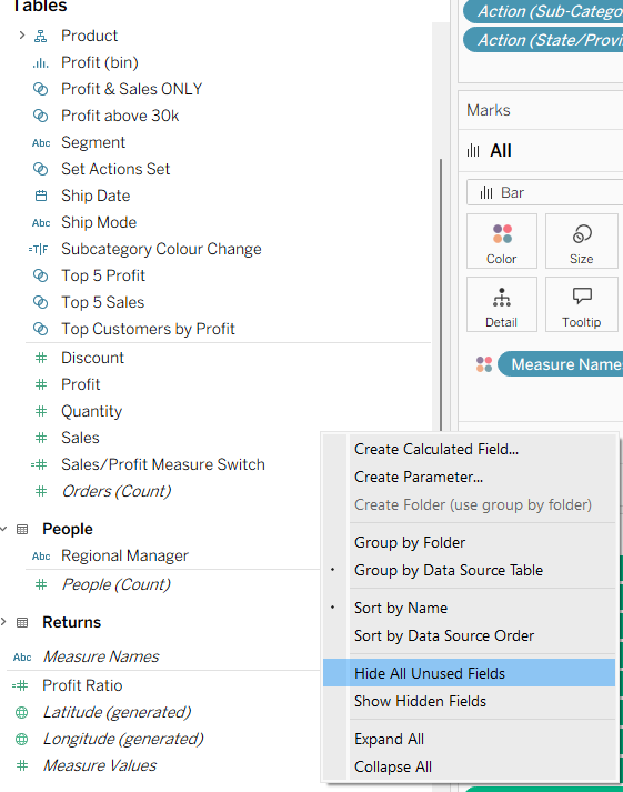 There’s a quick way to clean this up. From the data pane menu, you can select “Hide All Unused Fields”, and Tableau will automatically hide anything that isn’t being used in your worksheets.